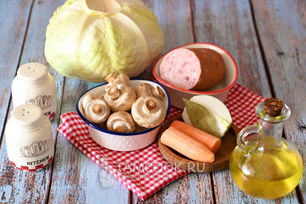 Соберите необходимые продукты для приготовления тушёной капусты с грибами и колбасой.
