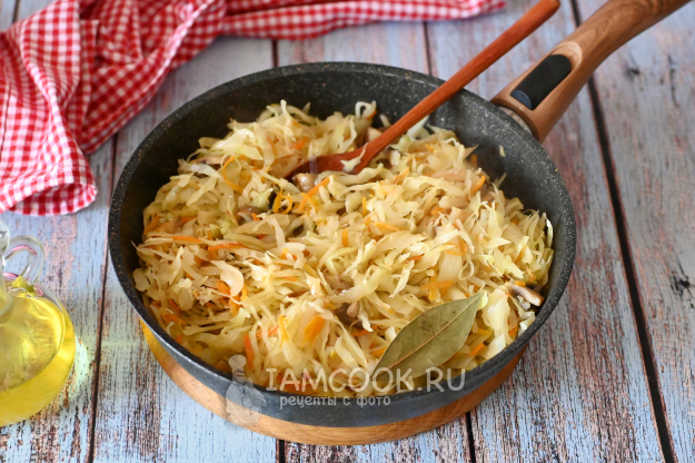 На сильном огне сначала чуть обжарьте капусту, помешивая, около 5-7 минут, чтобы она осела и начала подрумяниваться. После чего можно посолить и поперчить по вкусу, а также добавить лавровый лист (или какие-то специи, если хотите).