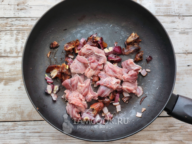 Следом на сковороду выложить мясо, перемешать, продолжить жарку в течение 10 минут.
