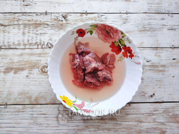 Мясо промыть, залить холодной водой и оставить на час при комнатной температуре. Затем еще раз промыть. Слить воду, говядину нарезать на небольшие кусочки.