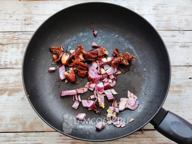 На сковороде разогреть масло. Отправить в сковороду финики и лук, обжаривать на среднем огне до мягкости луковых кубиков.