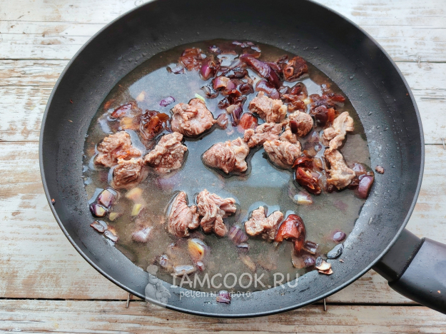 Добавить специи к содержимому сковороды, влить соевый соус и воду. Дать соусу закипеть, убавить огонь до минимального, продолжить тушение мяса почти до полного выпаривания жидкости на сковороде, тушить около получаса. Должна получиться густая подлива из фиников и лука с мясом.