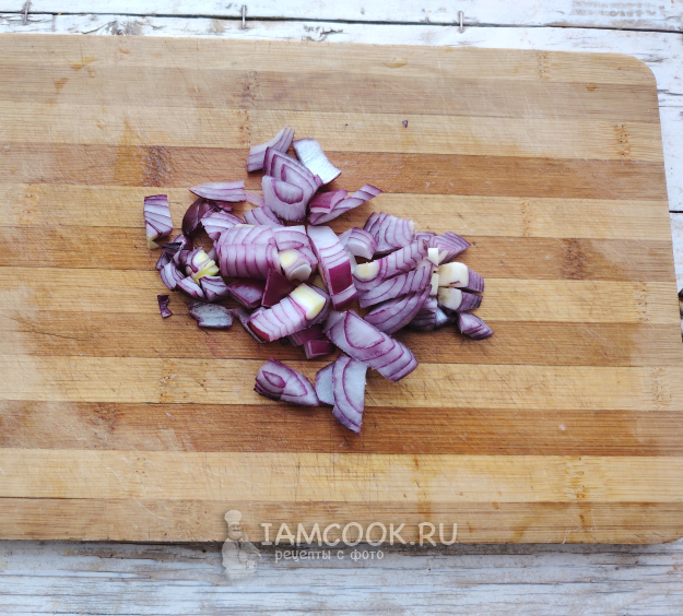 У фиников удалить косточки, мякоть разрезать на части. Луковицу освободить от шелухи, нарезать на половинки колец или на кубики.