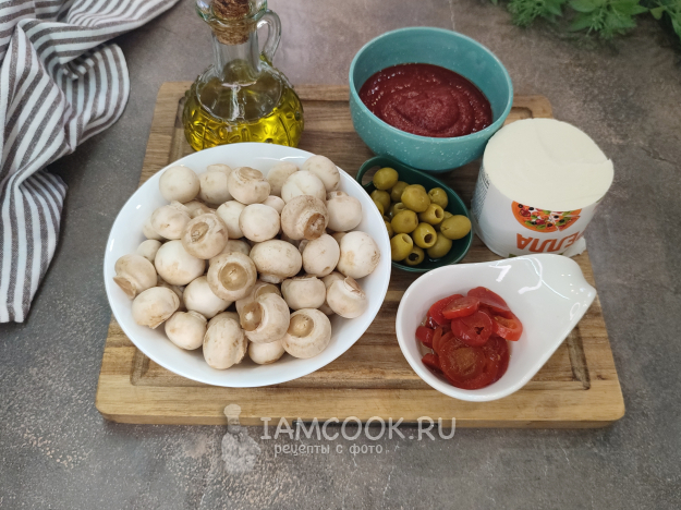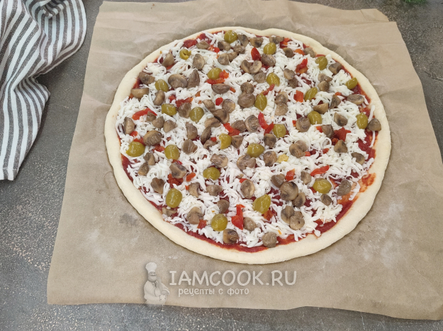 На сыр выкладываем халапеньо, грибы, оливки.