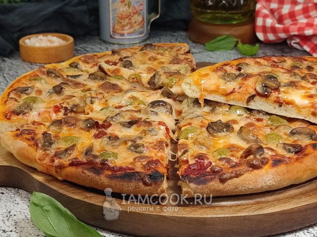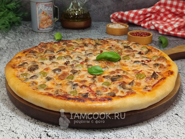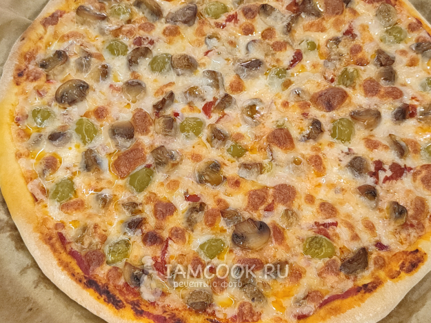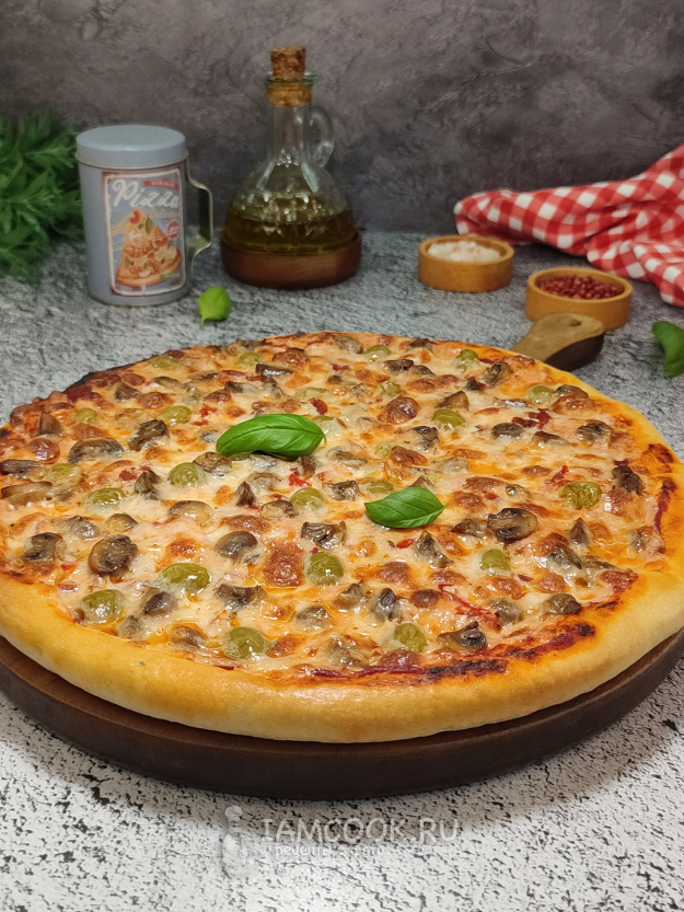 Пицца с грибами и халапеньо готова! Подавайте сразу, из печи. Можно готовую пиццу сбрызнуть оливковым маслом, чуть украсить зеленью.