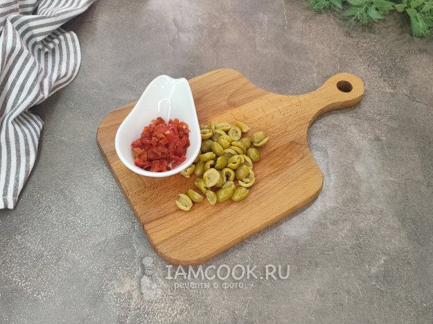 Халапеньо режу помельче, чтобы они равномернее распределились по пицце. Оливки режу на 2 части.
