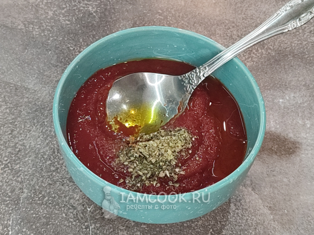 Для соуса к протертым томатам добавляем орегано, оливковое масло, соли по вкусу, перемешиваем.