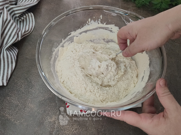 Замешивайте тесто сначала ложкой, затем, постепенно подсыпая оставшуюся муку, руками замесите мягкое, пластичное тесто. Муки может уйти больше или меньше, это зависит от самой муки.