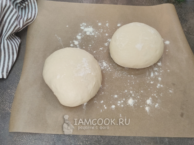 После второго подъема снова обминаем, делим тесто на 2 части, скатываем в колобки и вновь даем подняться (не забывая припылить их мукой и накрыть пленкой).