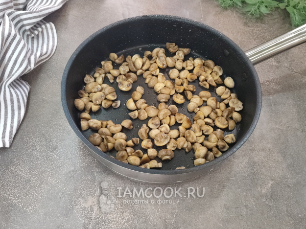 Тем временем приготовим начинку. В разогретом масле обжарьте грибы до испарения всей влаги и появления легкой румяной корочки, добавьте по вкусу соль. У меня грибы были мелкие, я разрезала их на 2 части, а те, что покрупнее, - на 4. Крупные шампиньоны нарежьте пластинками.