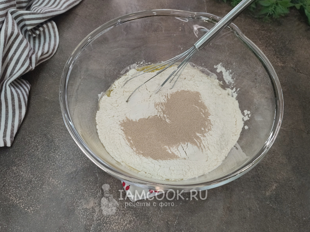 Сначала приготовим тесто. В глубокую миску влейте воду, масло, добавьте соль, сахар, перемешайте, затем всыпьте муку (примерно половину), дрожжи, перемешайте.