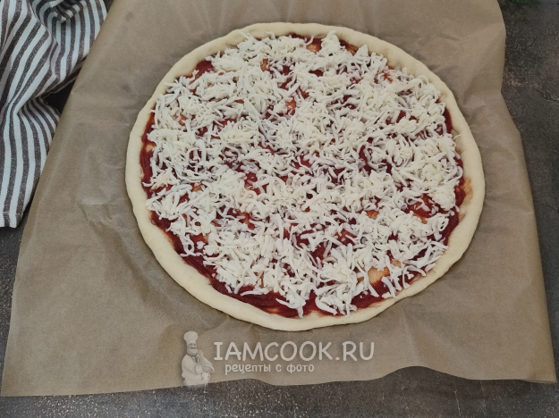 Собираем параллельно обе пиццы. Каждую лепешку смазываем соусом, затем распределяем по всей поверхности тертый сыр.