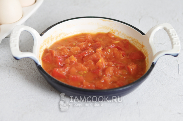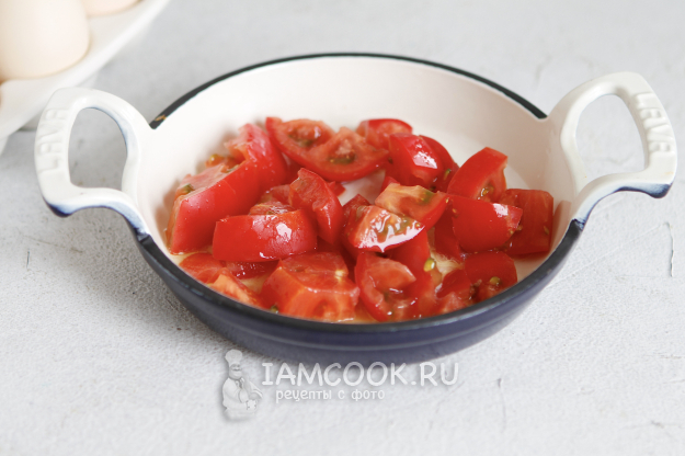Разогрейте сковороду. Влейте в нее масло (оливковое, подсолнечное, а еще лучше - топленое) и потушите помидоры в течение 7-10 минут.