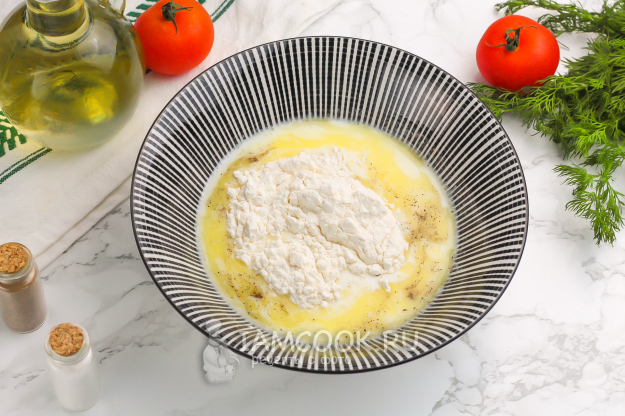 Растопите сливочное масло и влейте его в пиалу вместе с молоком. Добавьте соль и молотый черный перец, пшеничную муку. Тщательно все перемешайте с помощью венчика, чтобы удалить комочки.