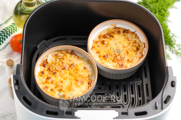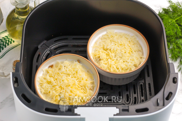Выложите сверху натертый сыр, равномерно распределите его и активируйте технику. Готовьте жульен в аэрогриле при 180 градусах 10 минут.