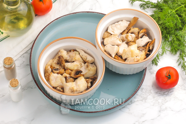 Выложите в небольшие огнеупорные формочки поджаренные грибы и курицу.