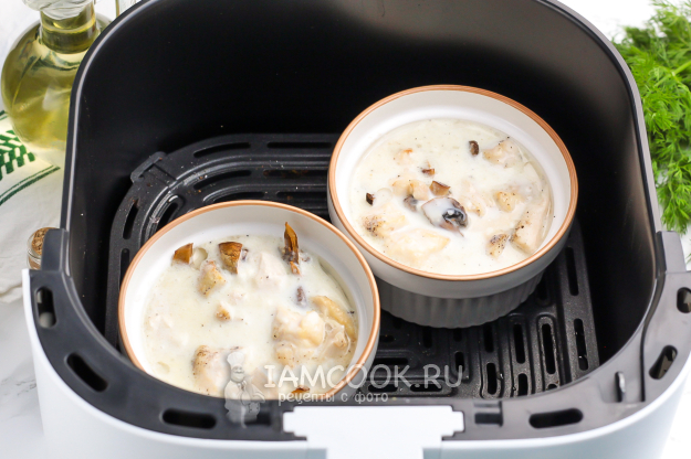 Поместите формы в чашу аэрогриля и залейте в них приготовленный соус.
