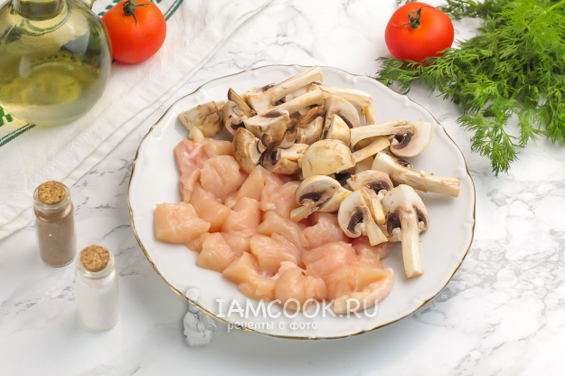 Промойте филе и обсушите бумажной салфеткой. Нарежьте небольшими кубиками. Промойте шампиньоны, обсушите салфетками и разрежьте каждый на 4 части. Лучше всего приобретать небольшие грибы, чтобы они быстро поджарились.