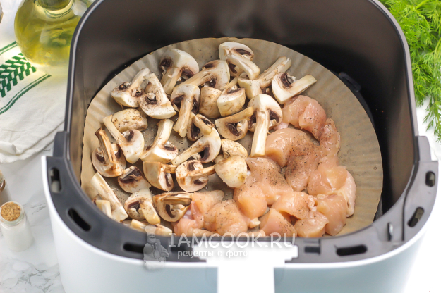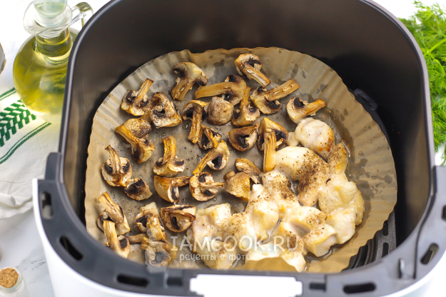 Смажьте пергаментную бумагу сливочным маслом и выложите на нее грибную нарезку и нарезку филе. Посолите и поперчите. Отправьте чашу в аэрогриль на 10-15 минут при 180 градусах. Время запекания зависит от мощности техники и величины нарезки.