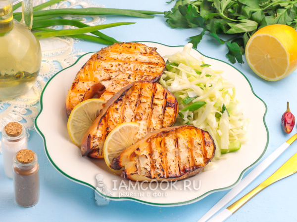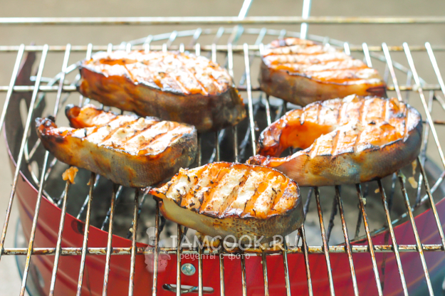 Рациональнее всего заранее разжечь угли в мангале и обжарить мясо, так как жар будет слишком сильный - для рыбы подойдет вторичный жар. Для этого разровняйте угли в мангале, можно их слегка побить для равномерности. Поднимите решетку чуть выше. Смажьте решетку растительным маслом, чтобы стейки не сильно к ней прилипали. Выложите на нее рыбу.