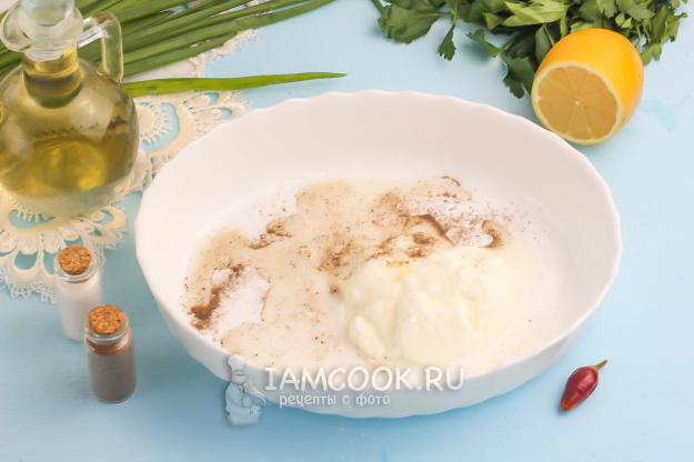 В глубокой емкости соедините сметану или греческий йогурт любой жирности с лимонным соком, солью и молотым черным перцем.