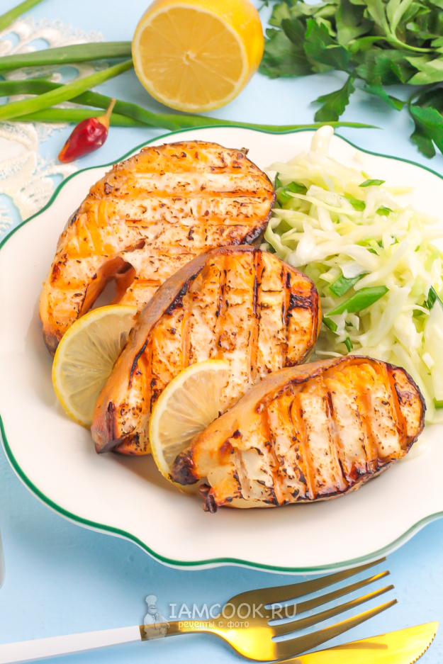 Стейки кеты на мангале полностью готовы! Выложите их на тарелки и подайте к столу, полив лимонным соком или каким-нибудь вкусным соусом.