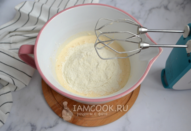 Всыпьте в чашу к основным ингредиентам муку с разрыхлителем.