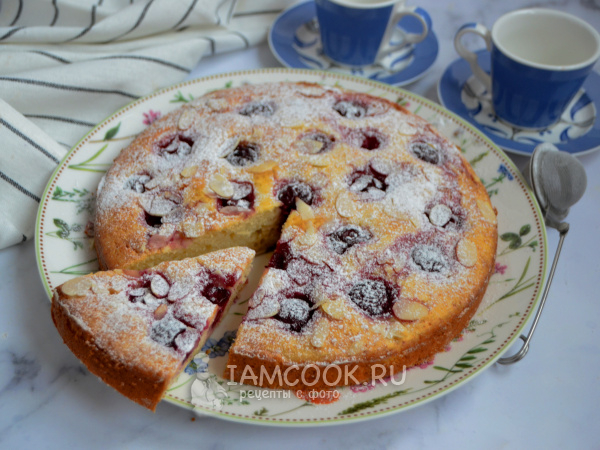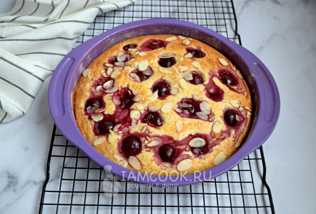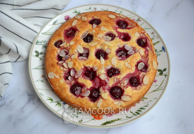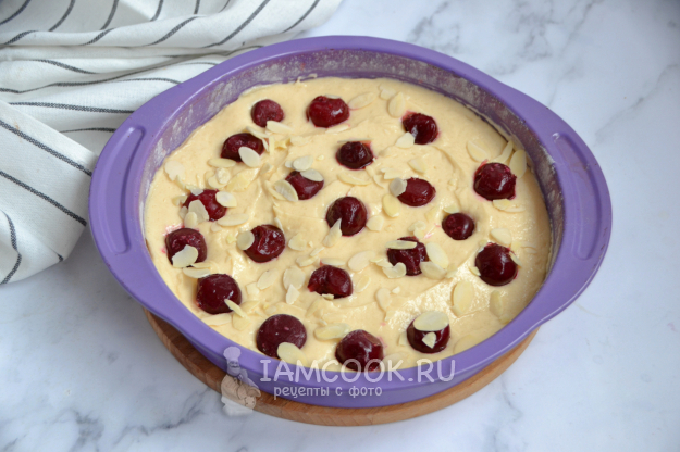 Сверху на тесто выложите вишню, присыпьте лепестками миндаля. Разогрейте духовку до 180 градусов в режиме "верх-низ". Выпекайте пирог до готовности, примерно 30 минут.