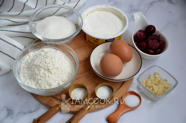 Ингредиенты для приготовления итальянского пирога с вишней и маскарпоне соберите по списку к рецепту. Если используете замороженную вишню, ее можно не размораживать.