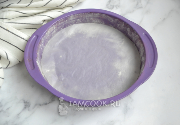 Подготовьте форму для выпечки, дно застелите пергаментом, бока смажьте сливочным маслом и слегка присыпьте мукой, излишки муки стряхните.
