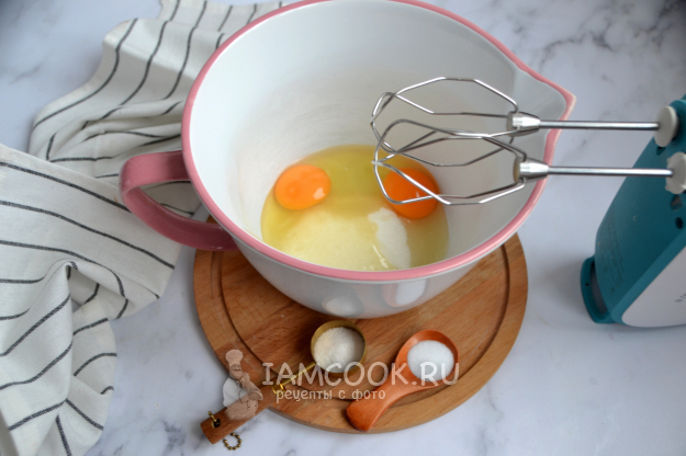 Добавьте в чашу для смешивания яйца, сахар, ванильный сахар.