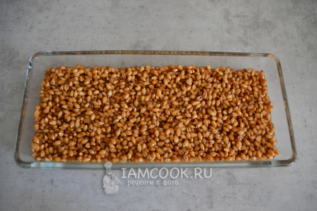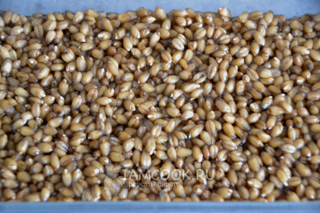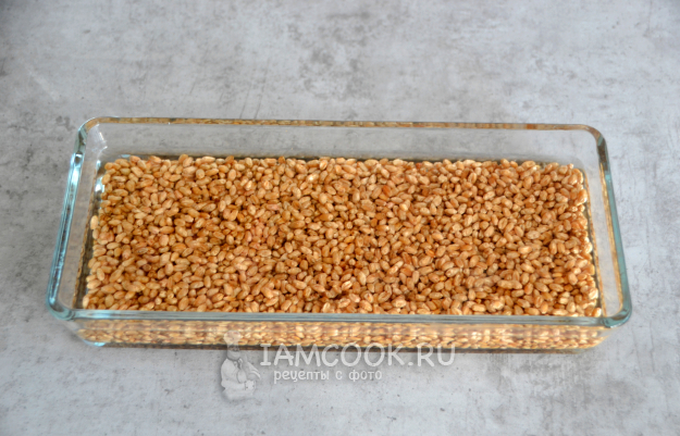 Выложите промытую пшеницу в емкость, залейте обычной водопроводной водой таким образом, чтобы вода была чуть выше уровня пшеницы, так как пшеница впитает в себя часть воды.