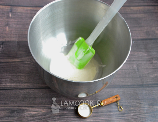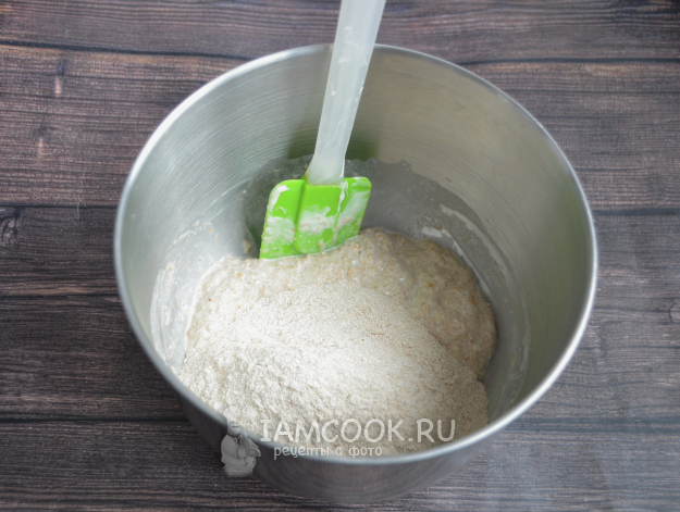 Приступайте к замесу основного теста. В миску для замешивания теста добавьте 50 г недостающей воды, 200 г закваски, всыпьте соль.