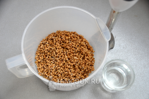Промойте зерна пшеницы, сложите в миску, добавьте 50 гр. воды, пробейте погружным блендером в однородную массу.