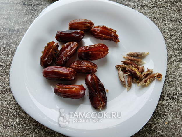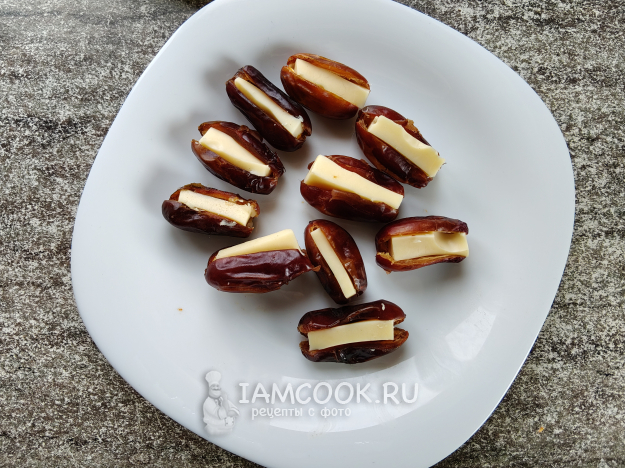 Чистые финики надрезать по центру, вынуть косточки.