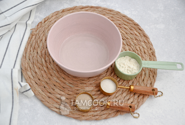Сначала приготовьте опару, для этого растворите в воде комнатной температуры дрожжи, сахар, добавьте 1 ст.л. пшеничной муки из общего количества, смешайте до однородности, накройте, оставьте в покое на 15-20 минут.