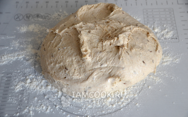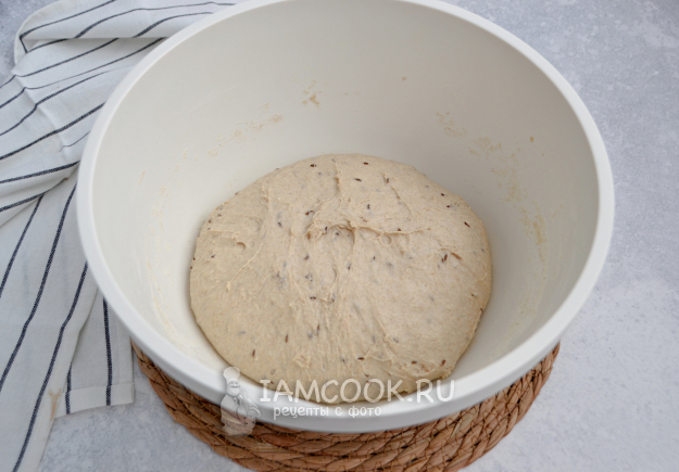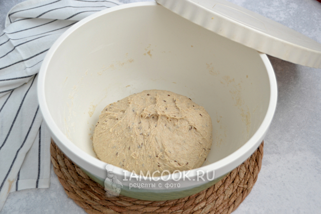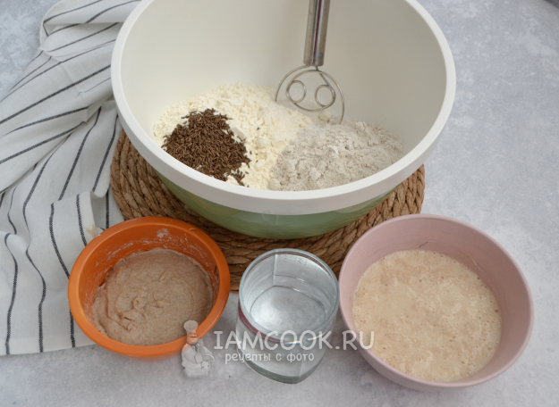В емкость для замешивания теста всыпьте пшеничную и ржаную муку, добавьте семена тмина, соль. Добавьте сюда же опару, приготовленную ранее, ржаную закваску и воду комнатной температуры.