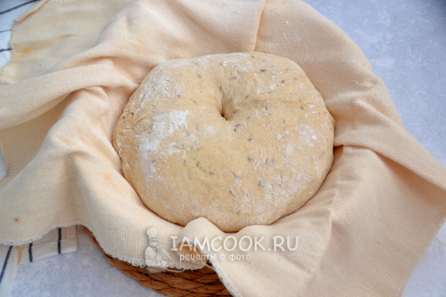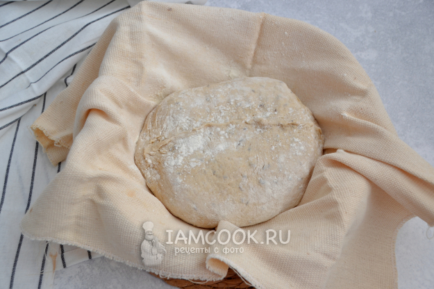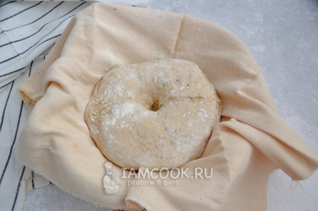 Уложите тесто в форму для расстойки "швом" вверх. Если нет специальной расстоечной формы, можно уложить тесто в миску (как на фото), застеленную тканью, в которую предварительно вбейте муку, чтобы тесто не прилипло во время расстойки.