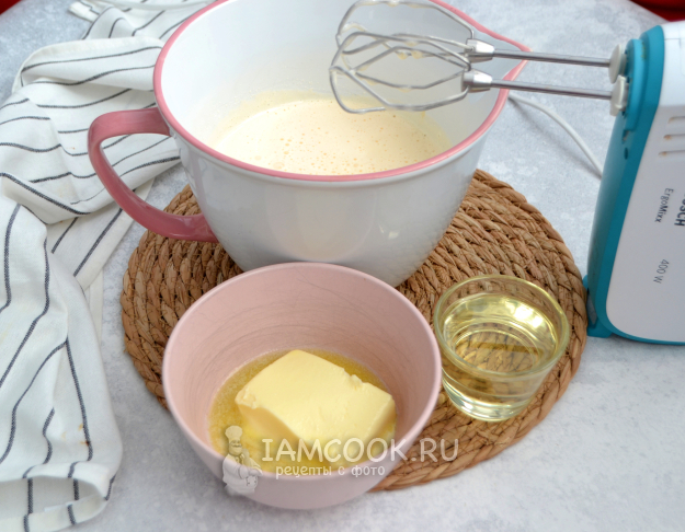 Добавьте в миску мягкое сливочное масло и растительное масло.