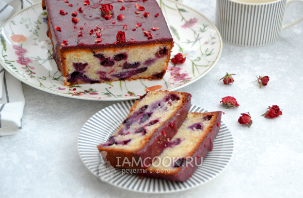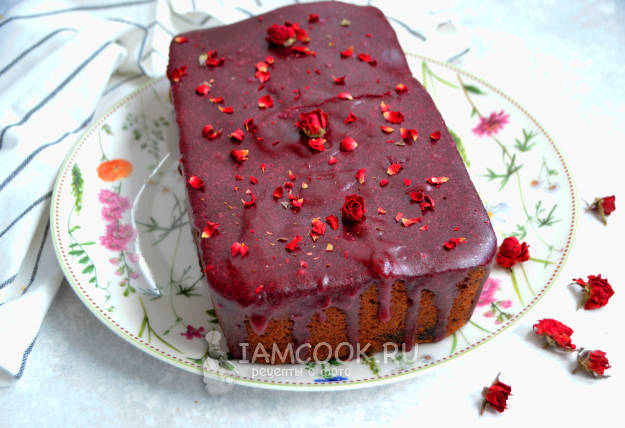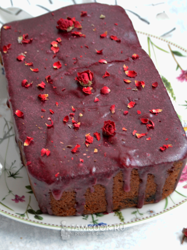 Покройте ягодной глазурью кекс. Можно покрывать глазурью еще теплый кекс. Ягодная глазурь быстро схватывается, поэтому если хотите чем-то украсить сверху, подготовьте заранее. В данном рецепте я посыпала лепестками миниатюрных роз.