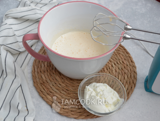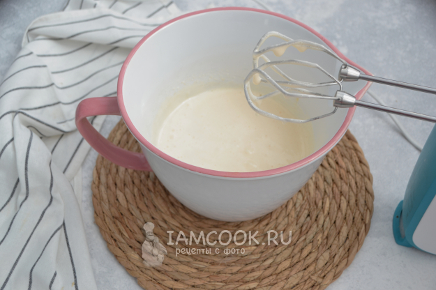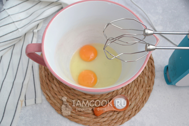 В миску для смешивания добавьте яйца, взбейте их с солью до пышной пенки.