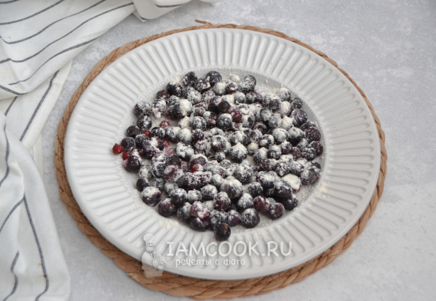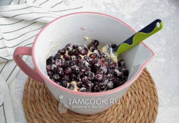 Присыпьте и смешайте с небольшим количеством муки (буквально 1 щепотка муки) ягоды, предназначенные для кекса. Это необходимо для того, чтобы при выпечке ягоды не опали, а равномерно распределились внутри кекса.