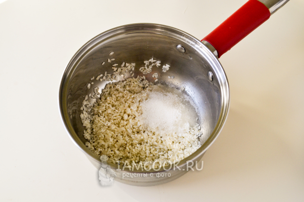 Круглый рис тщательно промойте до прозрачной воды. Положите рис в сотейник, добавьте сахар, щепотку соли и ванилин.