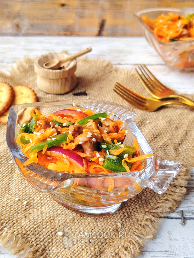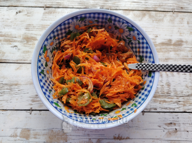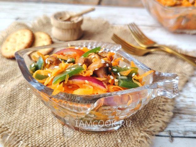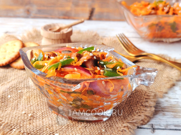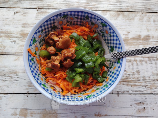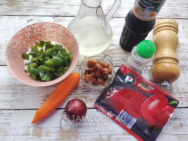 Собрать по списку продукты для морковного салата с перцем и маринованными грибами.