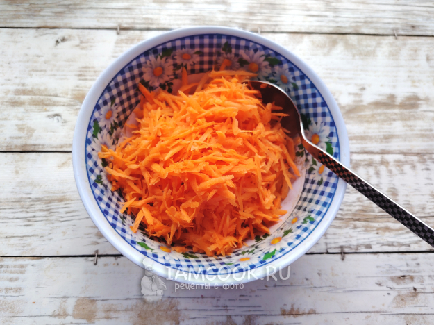 Морковь помыть, почистить, натереть на терке для корейской моркови или терке с крупной ячейкой.