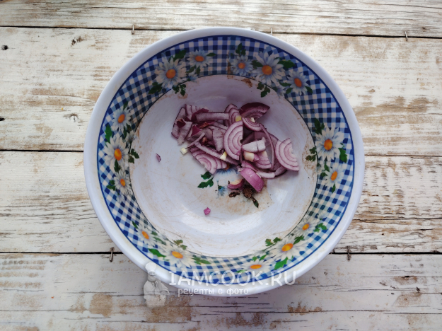 Луковицу очистить от шелухи, нарезать ее ножом на половинки колец.