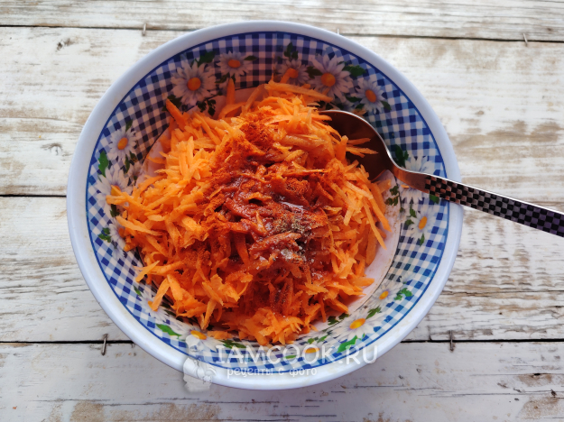 К моркови добавить специи, масло и соевый соус. Перемешать.