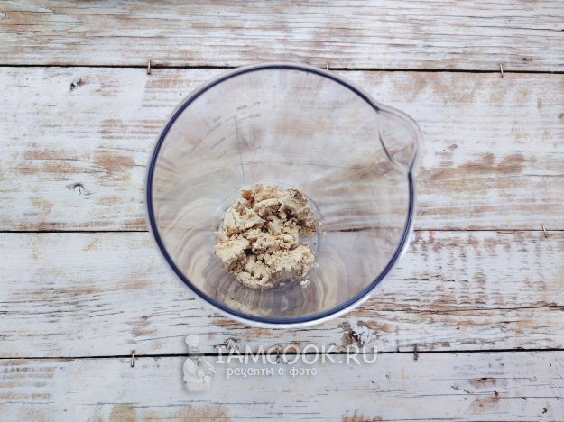 Халву раскрошить и поместить в емкость блендера для взбивания.