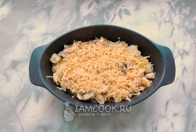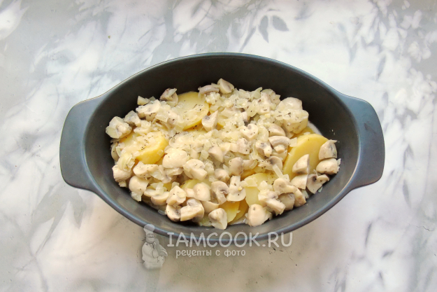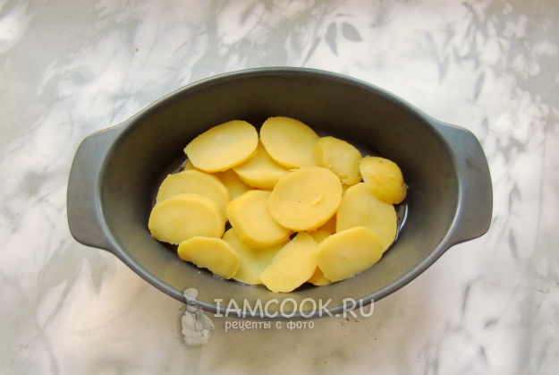 Картошку сварите в подсоленной воде до полуготовности. Охладите, нарежьте кружками и выложите в форму для запекания, смазанную маслом.