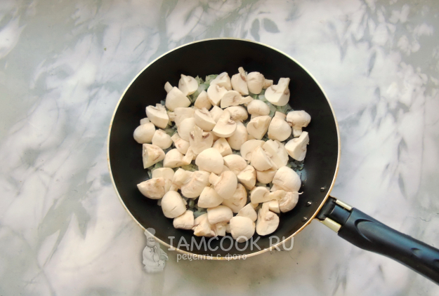 Шампиньоны очистите и разрежьте на 4 части. Добавьте в сковороду с луком.